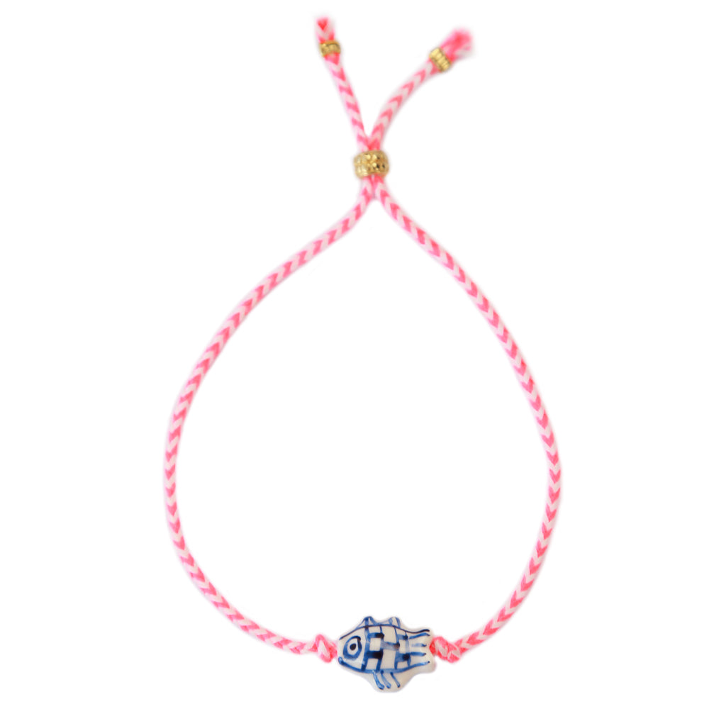 Cute bracelet of bright pink rope a blue and white fish charm. You can easily adjust the bracelet to size with the sliding knot.