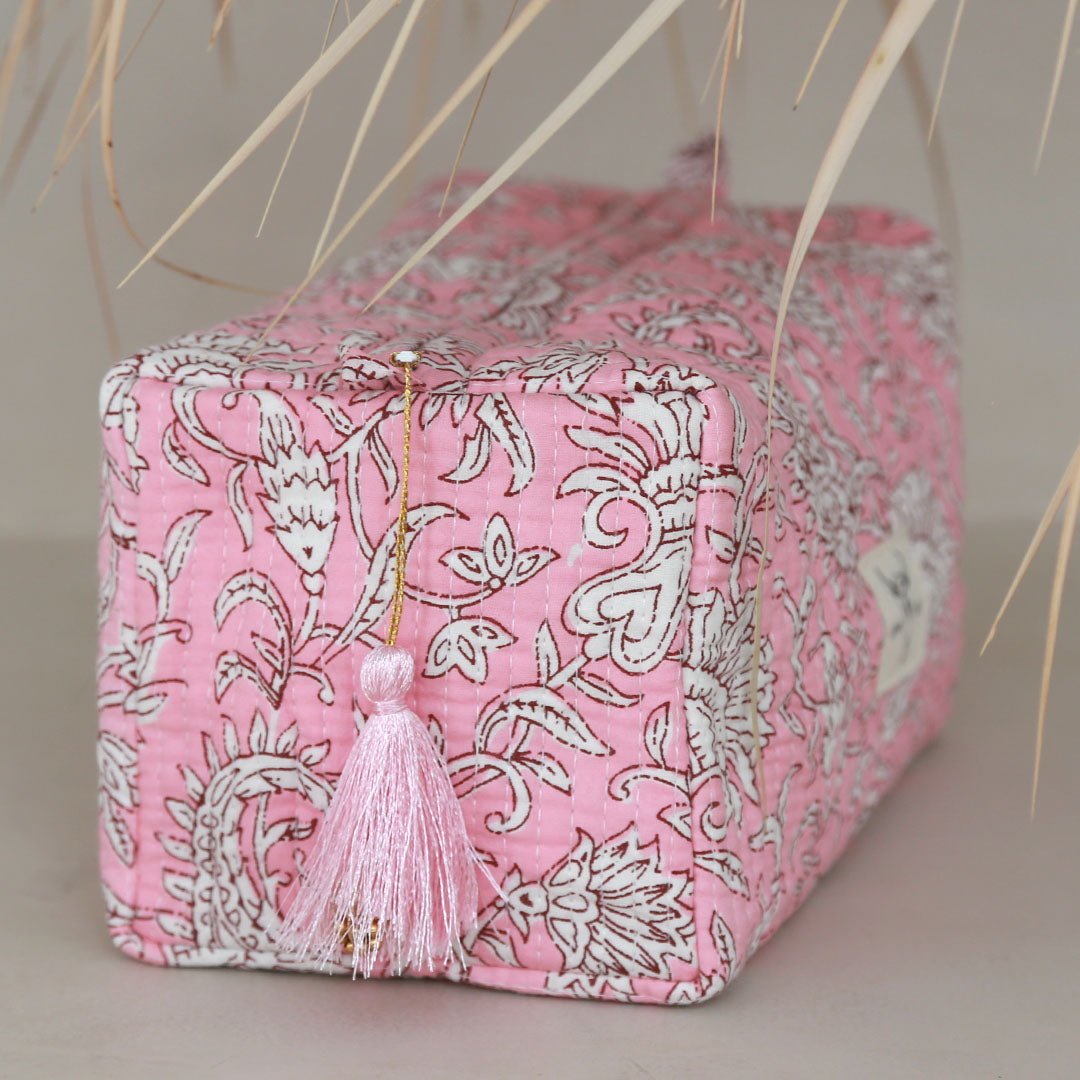 In this colorful blockprint cotton toiletry bag, you can take all your toiletries and makeup with you...