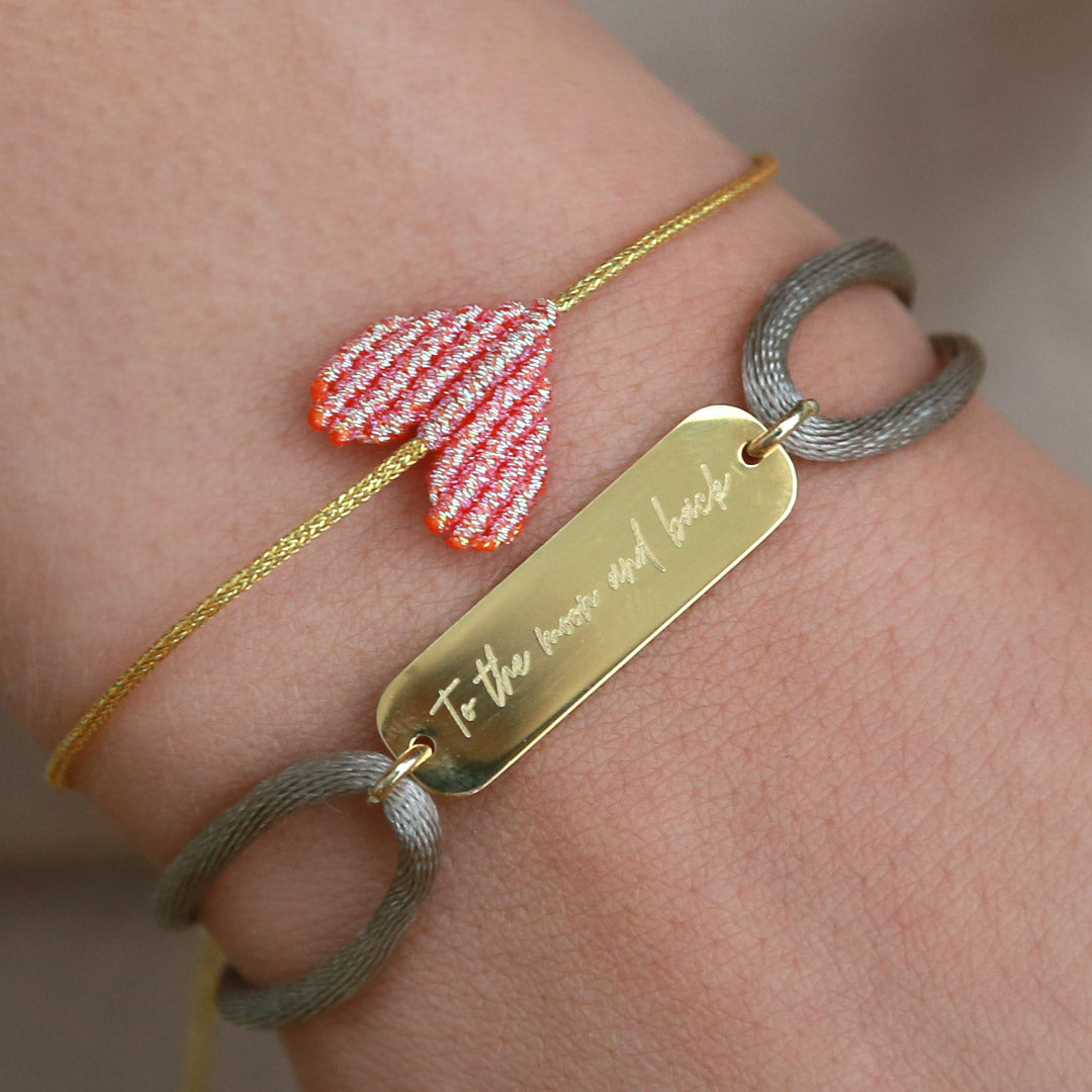 Engraved bracelet with the text 'I love you' and 'to the moon and back'. Also available in silver and a color strap of your choice.