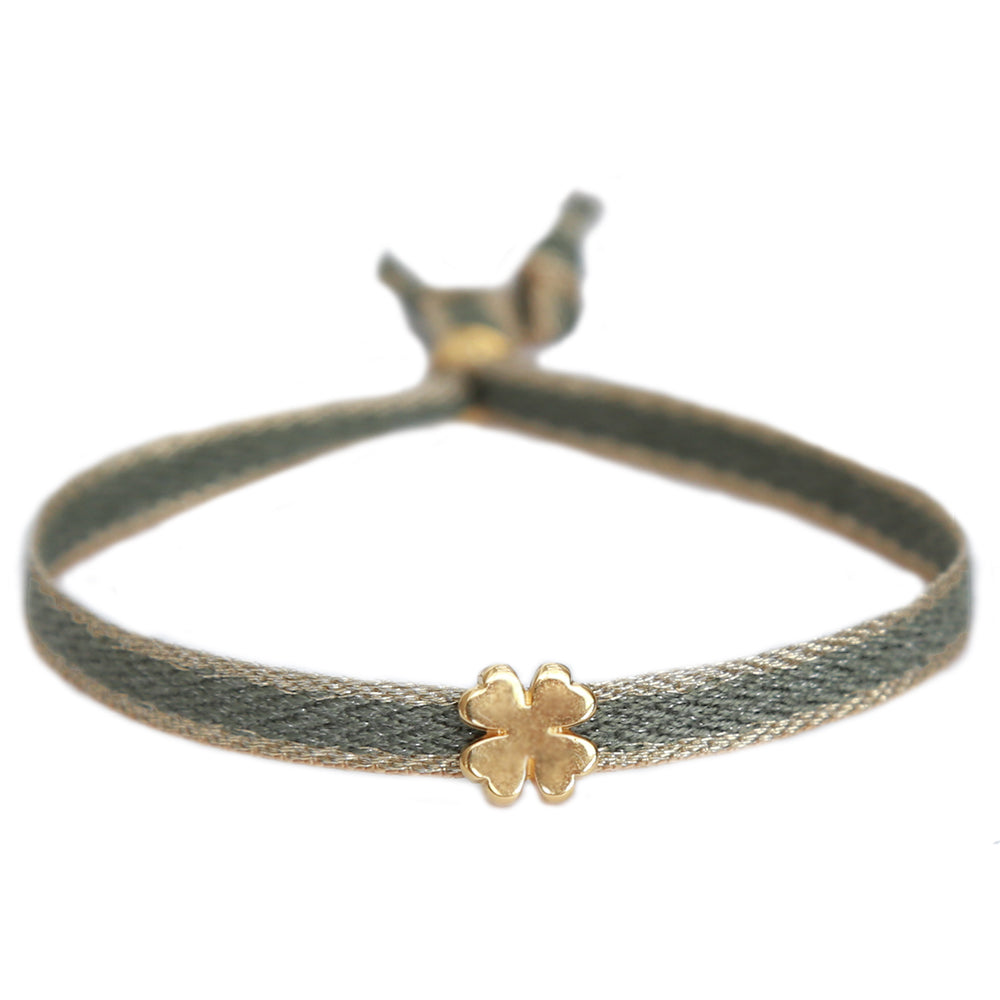 Finely woven bracelet in a green color with gold edges and a gold clover charm. You can adjust the bracelet to size by means of the gold bead.