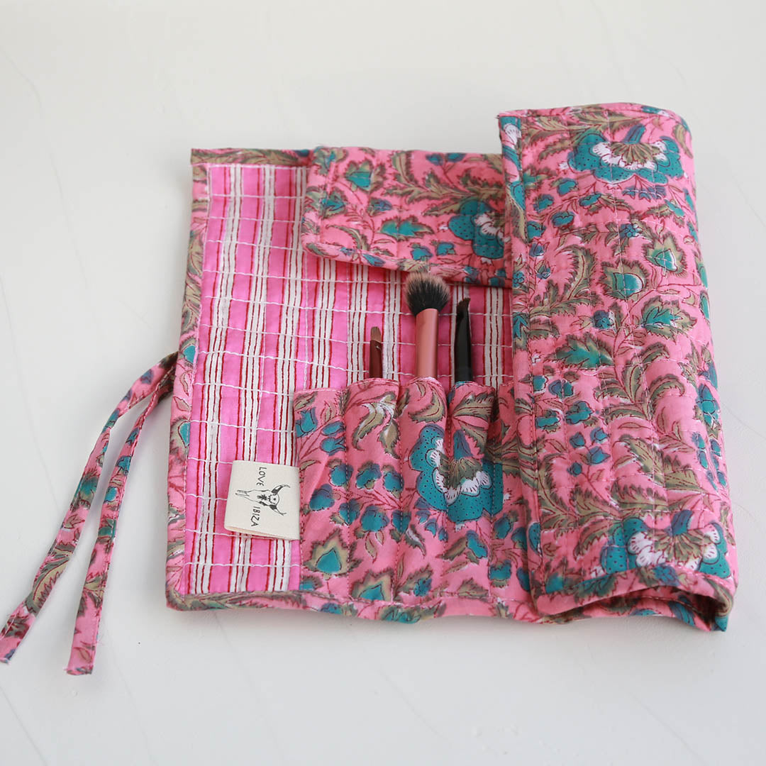 This makeup brush roll is a great way to keep your brushes clean, stored and organised in one place. Handmade in a beautiful block print fabric, with plenty of compartments to conveniently store your thick and thin brushes.