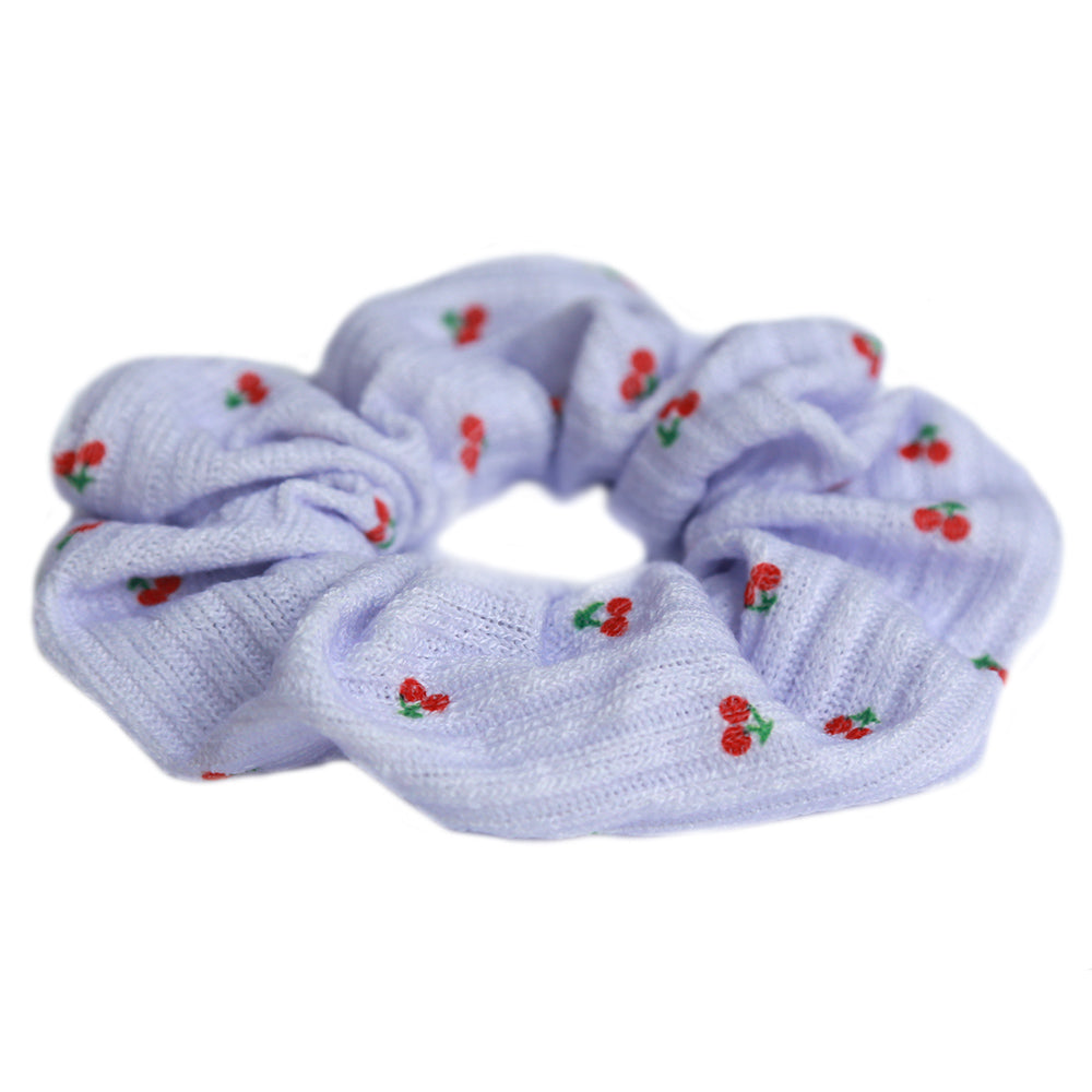 Cute purple scrunchie with a print of small cherries.