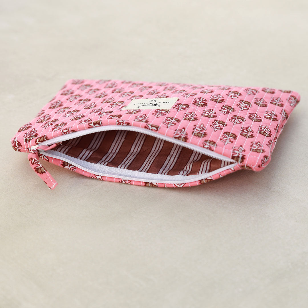 Niedliches Kosmetiktäschchen mit Blockdruck in verschiedenen Farben. Es ist super praktisch als Kosmetiktasche, eignet sich aber auch perfekt zur Aufbewahrung kleinerer Utensilien in einer größeren Tasche.