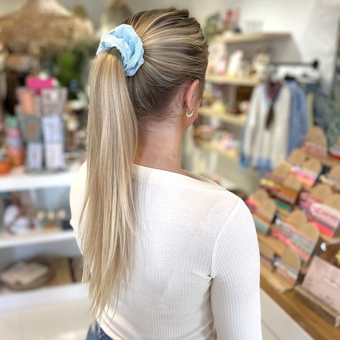 ¡Esta coleta bordada azul le dará un toque divertido a tu coleta o moño! Además de ser ideal para el cabello, también queda genial en la muñeca.
