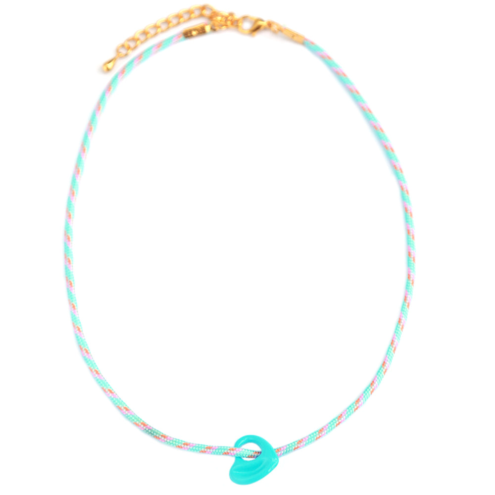 Joli collier composé d'un cordon de couleur bleu et rose et d'une petite breloque coeur !
