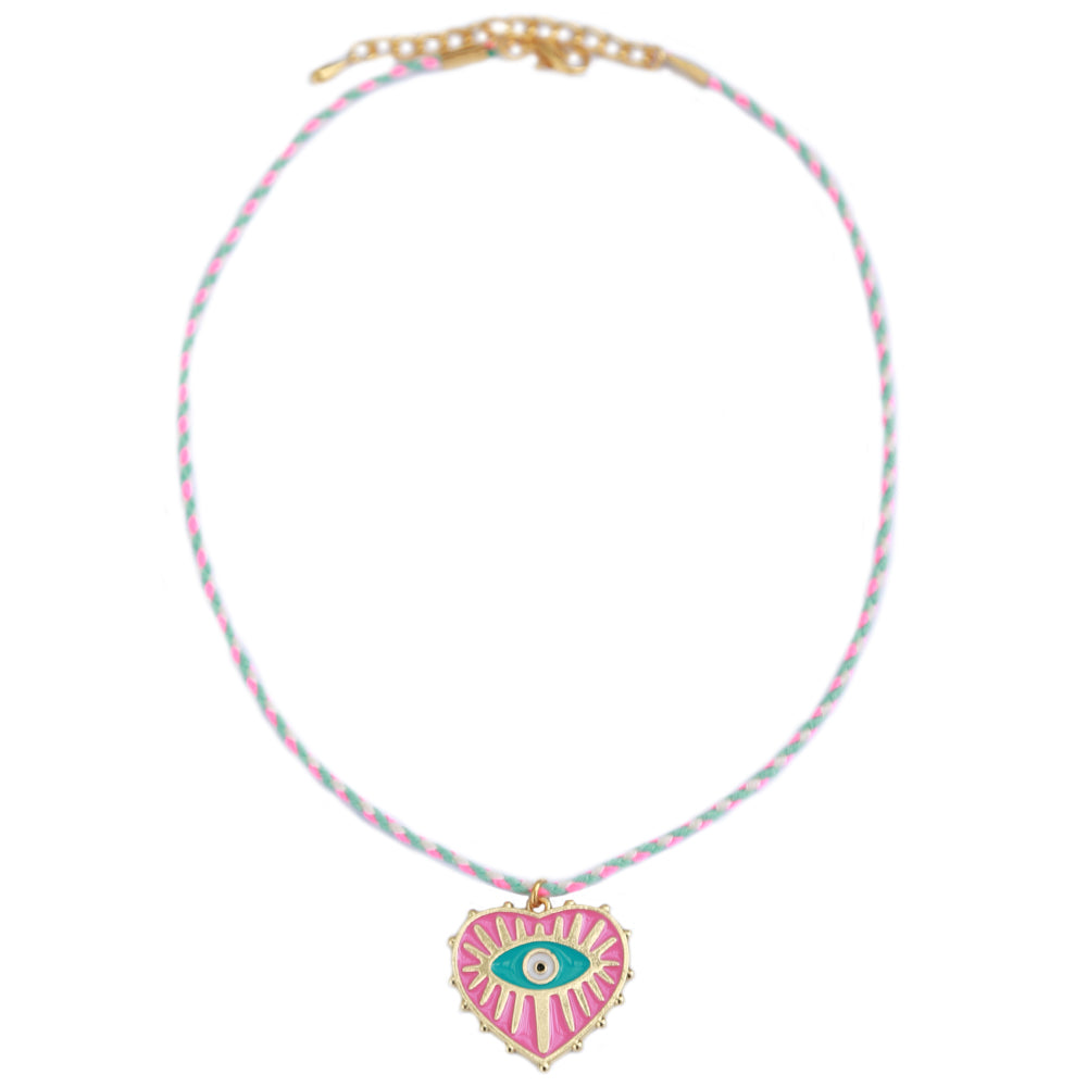 Joli collier fil rose avec une breloque coeur avec un mauvais œil !