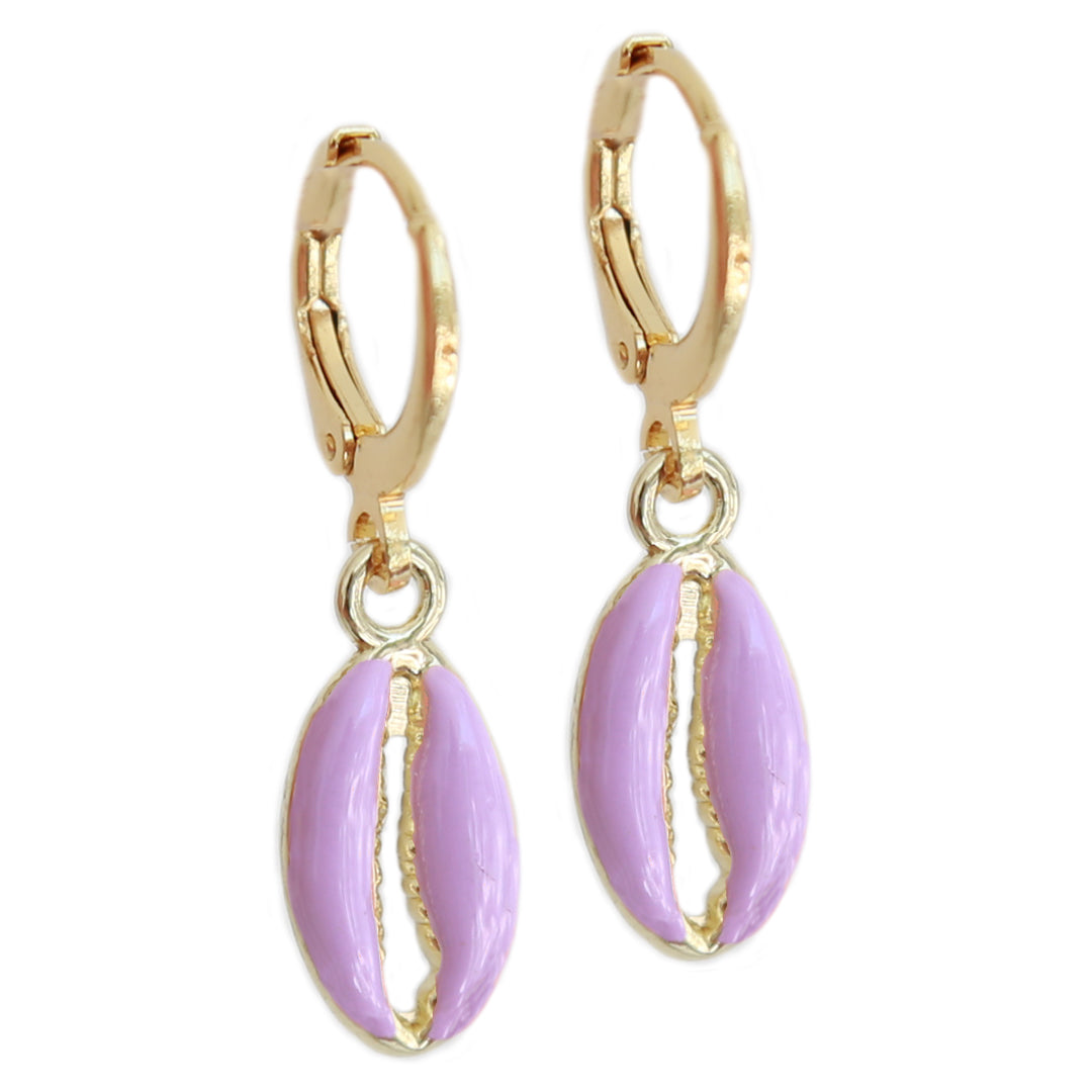 Leuke gouden oorbellen met een schelpen bedeltje in een paarse kleur!