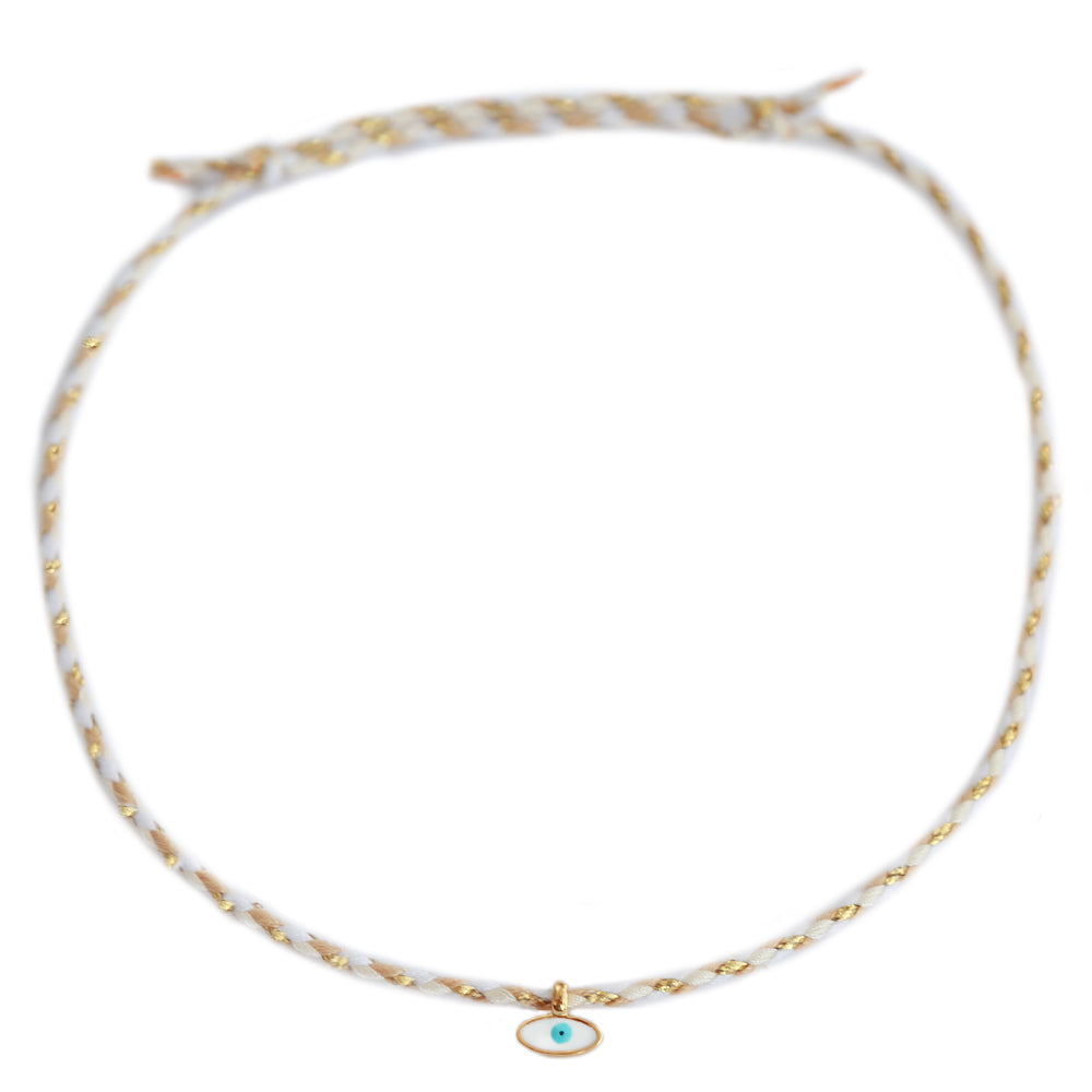 Feines Fußkettchen aus weißem und goldenem Garn mit einem kleinen goldenen Bösewicht-Anhänger.