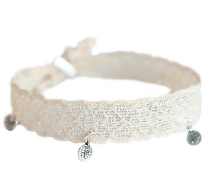 Dieses cremefarbene Spitzen-Fußkettchen hat schöne silberne Münzanhänger.