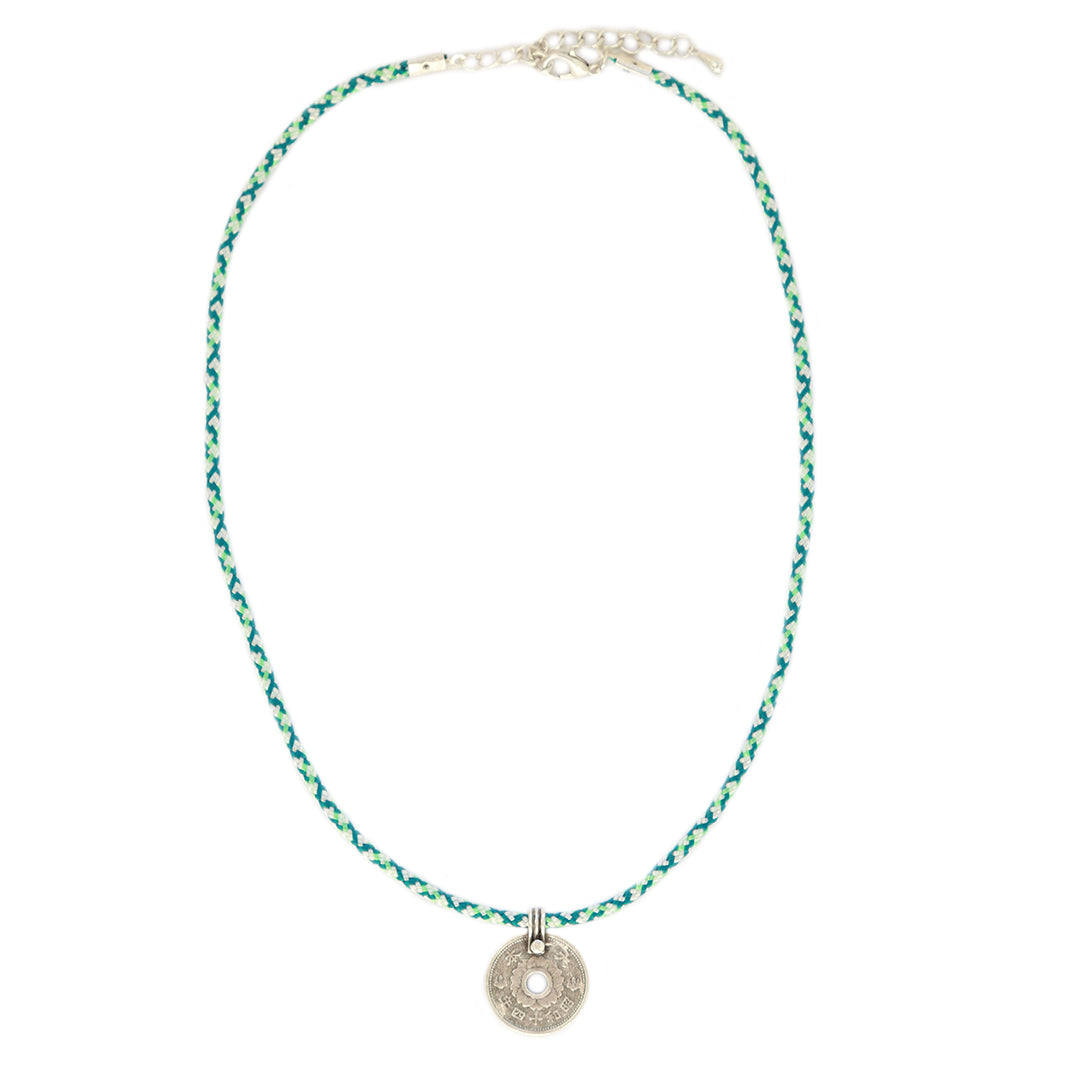 Schöne Halskette aus farbiger Kordel und einem silbernen Anhänger.